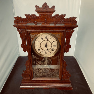 Description: Antique Seth Thomas Parlour/Mantle Carved Wood Chiming Clock, 14"x 4.5"x 21"Condition: Good/FunctionsDetails: Includes 2 Keys