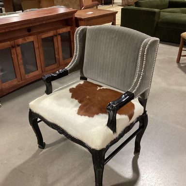 Carved Wood Cowhide & Grey Velvet Nailhead on Casters Chair 28"x 25"x 37"
