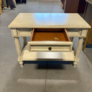 Description: Vintage White Washed Wood 2 Tiered 1 Drawer End TableCondition: Wear Consistent with Age