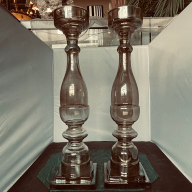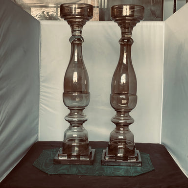 Description: Heavy Smoked Glass Candle Holders-Pair, by Zodax, Made in IndiaCondition: GoodDetails: Approximately 6" x 6"x 23" Each