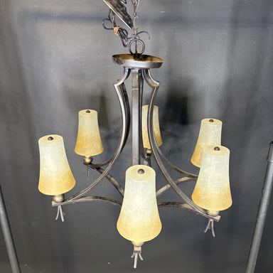 Description: Traditional 6-Light Bronze and Gold Painted Metal with Ombré Glass Shades Chandelier Condition: goodDetails: needs a good cleaning, 1 ...