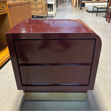 Description: Maroon Lacquer Finish & Brass Finish Base 2 Drawer NightstandCondition: Slight Lacquer Scratches