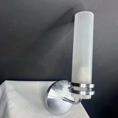 Description: Modern 1-Light Chrome with Frosted Glass Shade Wall Sconce Condition: GoodDetails: upward facing vanity wall sconce