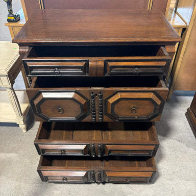 Description: Dark Finish Carved Wood Detail 4 Drawer Rustic Panel Style DresserCondition: Great