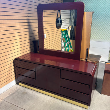 Description: Maroon Lacquer Finish & Brass Finish Base 6 Drawer 2 Door with Mirror DresserCondition: Small Lacquer Scratches