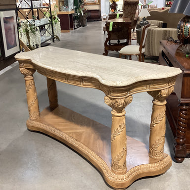 Description: Bernhardt Athena Collection Ornate Carved Light Finish & Travertine Style Stone Console Sofa Table Condition: Great, Slight Wear