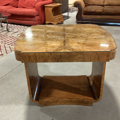 Description: Vintage Art Deco Style Burl Maple Book Matched with Glass Top Accent TableCondition: Some Scuff Scratches & Chips