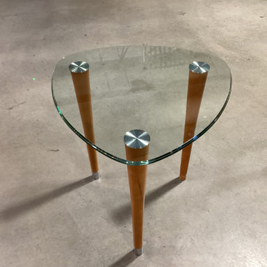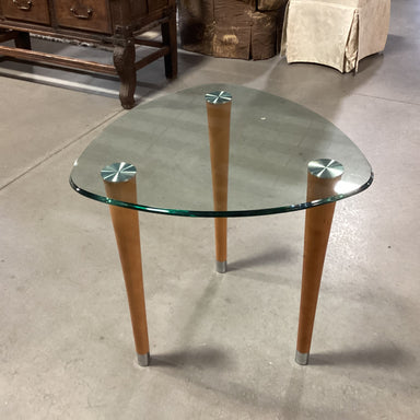 Description: Modern Triangle Glass & Wood Legs End TableCondition: Some Wear