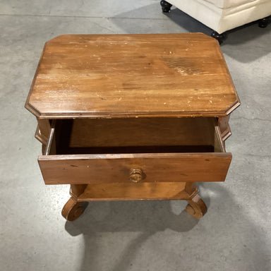 Description: Carved Distressed Pine 1 Drawer End TableCondition: Wear Scratches