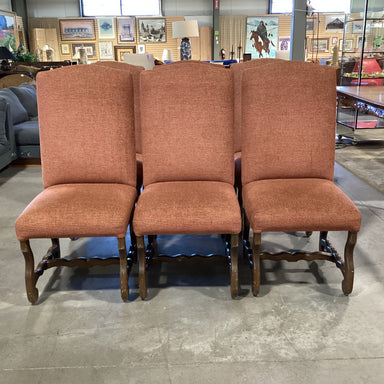 Description: Set Of 6 Red Tan Woven Nailhead & Carved Wood Dining ChairsCondition: Good, Upholstery Wear & Wood Finish Scratches