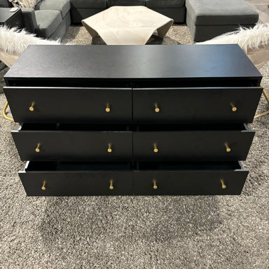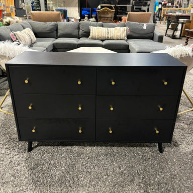 Description: Black Laminate with Gold Pulls 6 Drawer DresserCondition: Great
