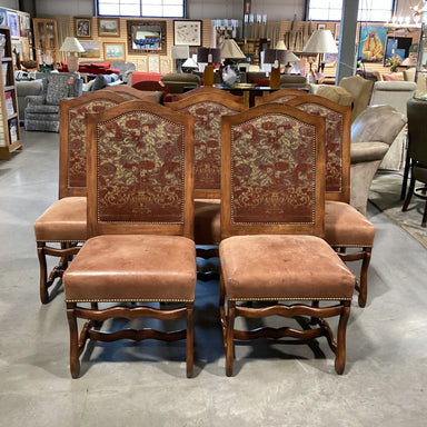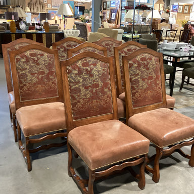Description: SET of 8 Gina B Custom Carved Wood Leather & Upholstery Nailhead Dining ChairCondition: Leather Wear Stains & Wood Scratches