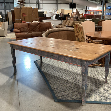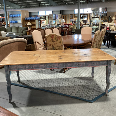 Description: David Marsh Studio Blue Pink Fun Painted Edge & Legs Distressed Pine Dining TableCondition: Slight Wear, Purposeful Distressing