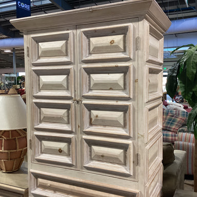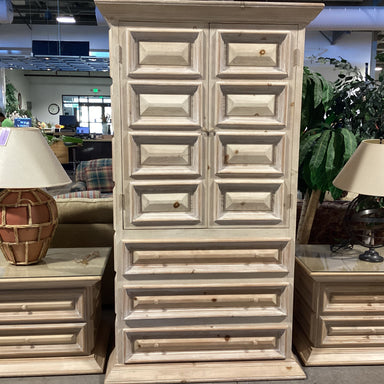 Description: Kreiss Collection Natural Solid Carved Wood 2 Door 3 Drawer ArmoireCondition: Great, Solid Wood, Hand CraftedDetails: HEAVY DELIVERY