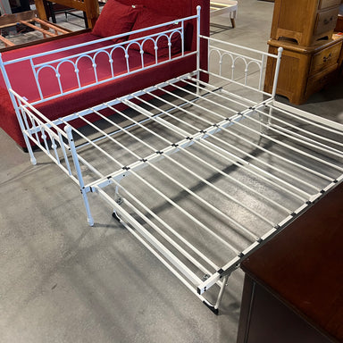 Description: TWIN White Metal Trundle Bed SetCondition: Good Some Scratches and A Missing Wheel