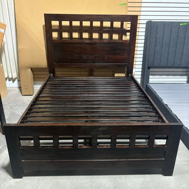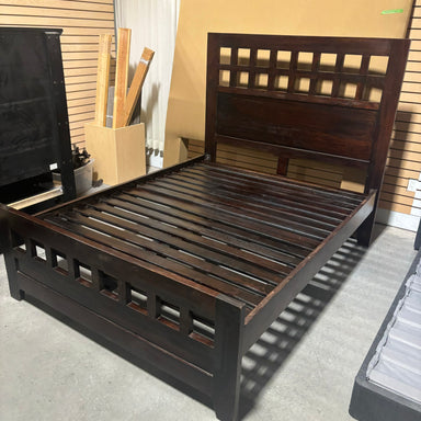Description: QUEEN Dark Finish Solid Wood Sleigh BedCondition: Wear & ScratchesDetails: No Slats or Crossbar