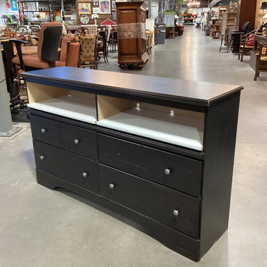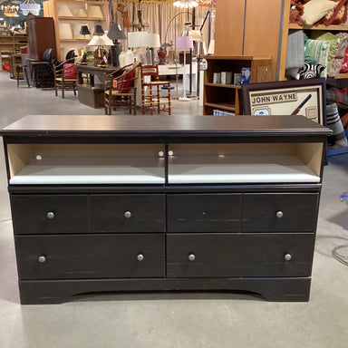Description: Wood Style Laminate 4 Drawer with Cubby Shelves DresserCondition: Some Wear Scratches, Missing 1 Drawer Pull, Converted Top Drawers to...