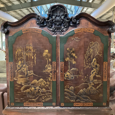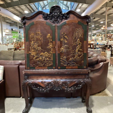 Description: Vintage Ornate Carved Wood with Chinoiserie Raised Painted 2 Door 2 Piece ArmoireCondition: Wear ScratchesDetails: HEAVY DELIVERY