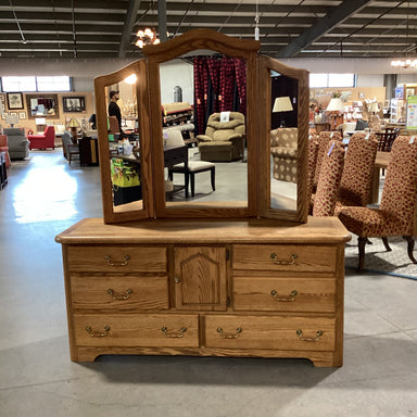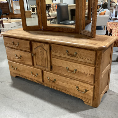 Description: Oak 6 Drawer 1 Door with Tri Fold Mirror Dresser Condition: Slight WearDetails: Solid Piece with Dovetail Drawers