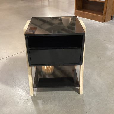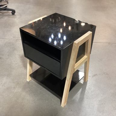 Description: Black Lacquer & Natural Wood 1 Drawer NightstandCondition: Some Wear Scratches