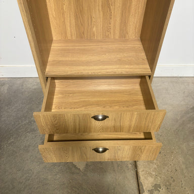 Description: Light Brown Wood Laminate 2 Drawer 2 Shelf Standing Wardrobe Condition: GoodDetails: Builtin, has a cutout for electrical box in top left