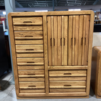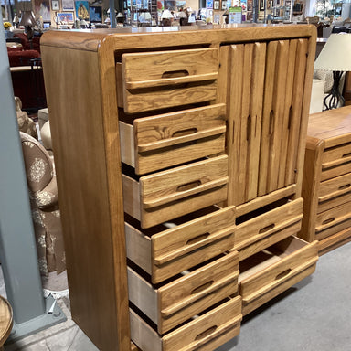 Description: Vintage Finished Oak 8 Drawer 2 Door with Shelves Chest DresserCondition: Wear Consistent with Age, Overall Nice Condition