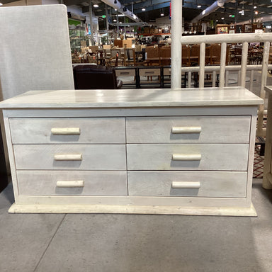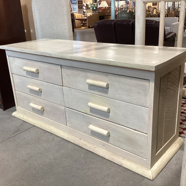 Description: Cream Washed Wood & Log Custom 6 Drawer DresserCondition: Some Wear Scratches, Purposefully DistressedDetails: SPECIAL DELIVERY