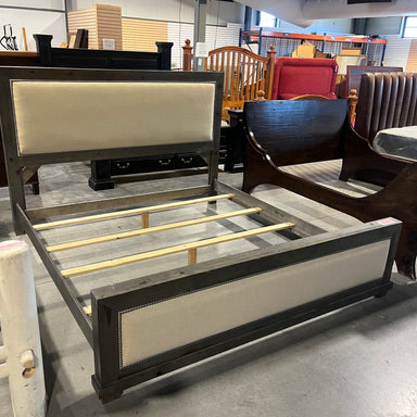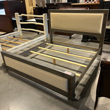 Description: KING Solid Grey Washed Wood With Linen and Nail Head Bed SetCondition: Great