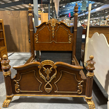 Description: QUEEN Ornate Carved Solid Wood with Gold & Dark Brown Finish & Claw Feet Poster BedCondition: Good, Some WearDetails: NO SLATS