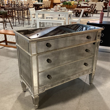 Description: Antiqued Wood & Mirrored 3 Drawer ChestCondition: Some Finish Wear & Scratches