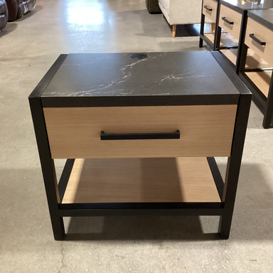 Description: Artco Washed Oak Black Metal & Stone Top with Electrical & USB 1 Drawer Nightstand Condition: Great