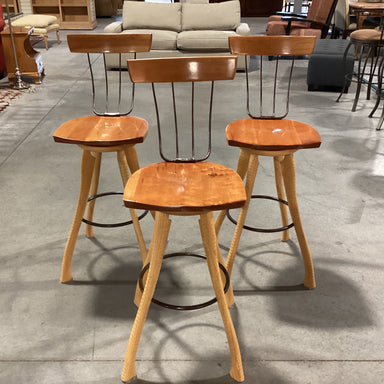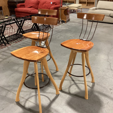 Description: SET of 3 Brad Smith Vintage 80's Carved Wood with Iron Pitchfork Back & Ring Footrest BarstoolsCondition: Some Wear & Wood Scr...