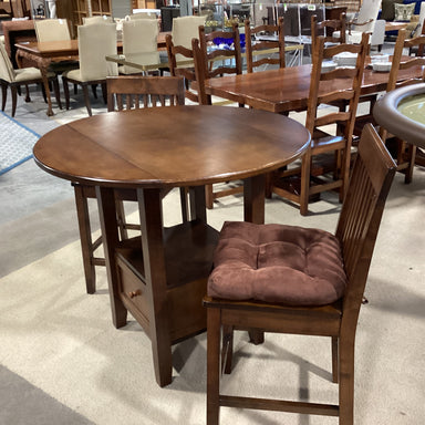 Description: Finished Wood Round with Drop Sides & 1 Drawer Pub Height Table with 2 Barstools Dining SetCondition: Some Wear Finish Scratches