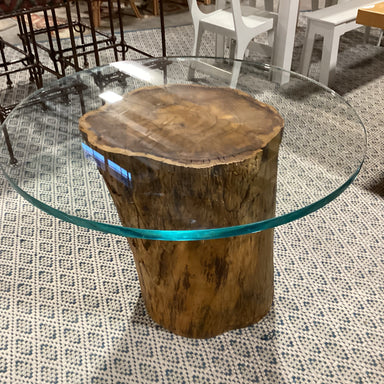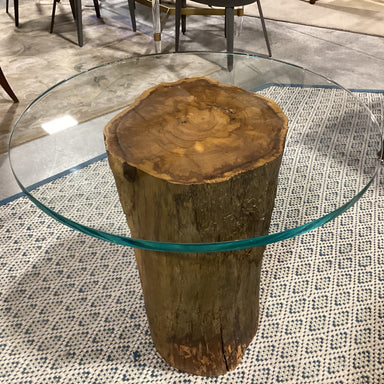 Description: Solid Log Stump with Round Thick Glass Dining TableCondition: Great, Custom PieceDetails: SPECIAL DELIVERY