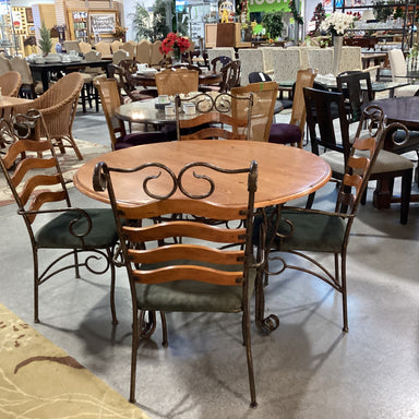 Description: Round Wood & Iron Table with 4 Chairs Dining Set Condition: Wood Scratches