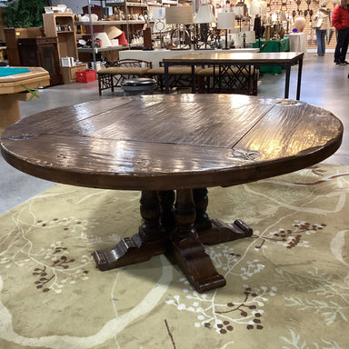 Description: Distressed Solid Wood Finish with Carved Fleur De Lis Detail Round Dining TableCondition: Some Scratches & Watermark