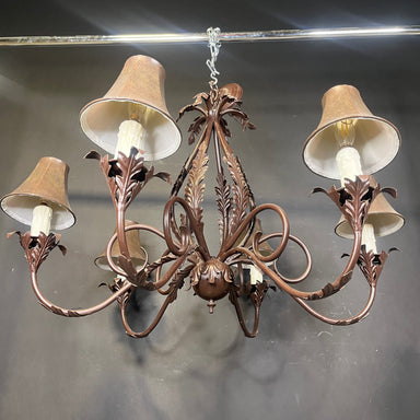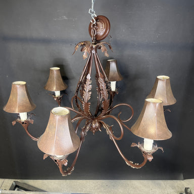 Description: French Country Style 6-Light Brown Leafy Metal with Shades Chandelier Condition: goodDetails: fun faux candle accents