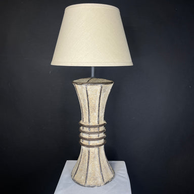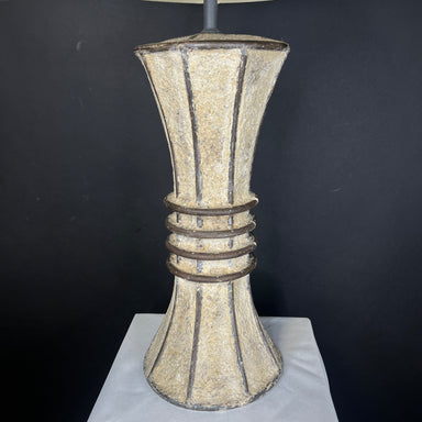 Description: Rustic Farmhouse Style Metal and Stone Hourglass with Shade Table LampCondition: goodDetails: