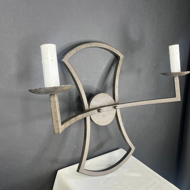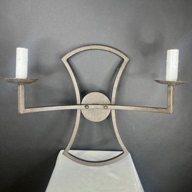 Description: Gothic 2-Light Bronze Brushed Iron Candelabra Wall Sconce Condition: goodDetails: requires two different bulb types