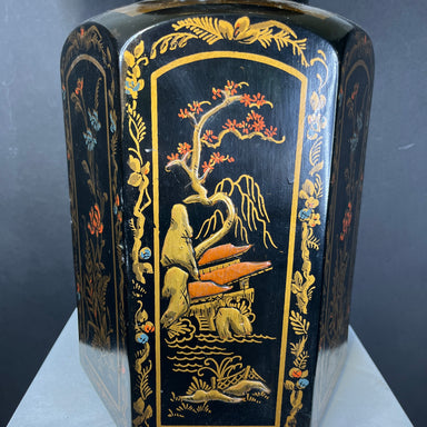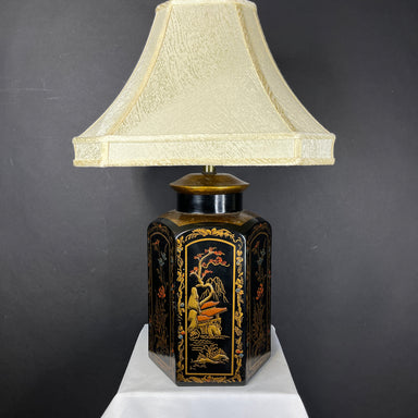 Description: Oriental Black and Gold Floral Chinoiserie with Shade Table LampCondition: goodDetails: vintage