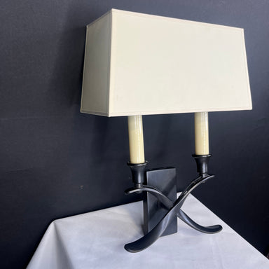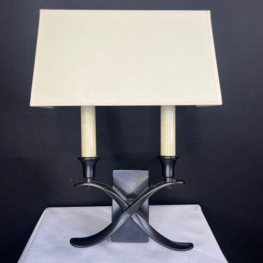 Description: Visual Comfort Chapman and Myers 2-Light Oil Rubbed Bronze Cross Bouillotte with Shade Wall Sconce Condition: GreatDetails: minor shad...
