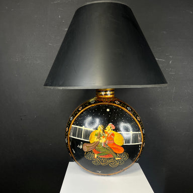 Description: Vintage Double Sided Hand Painted Black and Gold Lovers Metal Vase with Shade Table Lamp Condition: FairDetails: Some shade damage. Pa...