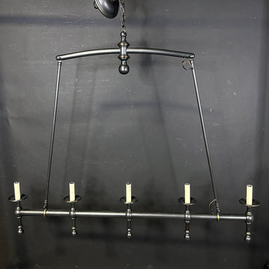 Description: Gothic Style 5-Light Blackened Brass Finish Metal Linear Candelabra Chandelier Condition: goodDetails: like new