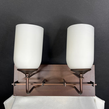 Description: Hubbardton Forge 2-Light Bronze with Milk Glass Shades Vanity Wall Sconce Condition: GoodDetails: Some wall paint and scuffs on glass ...