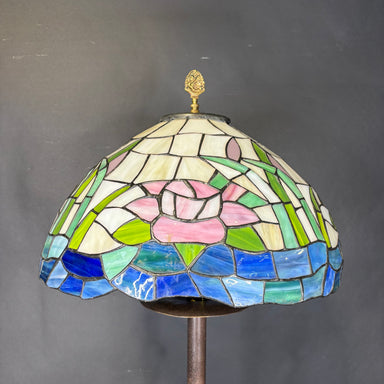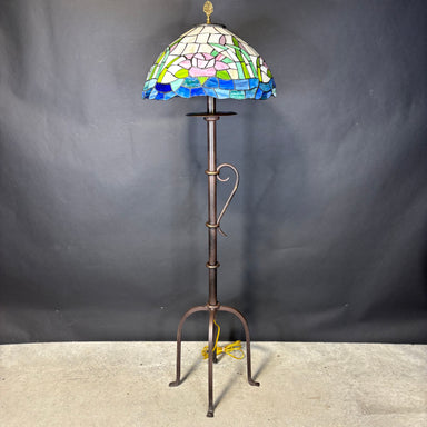 Description: Tiffany Style Bronze Iron Handled with Pink Floral Glass Shade Floor Lamp Condition: GoodDetails: minor crack in shades at the top