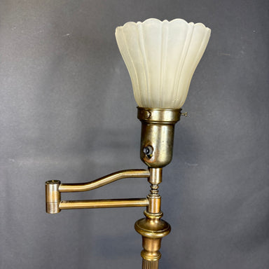 Description: Antique Ornate Brass Swing Arm with Glass Shade Floor Lamp Condition: GoodDetails: wear consistent with age, fragile