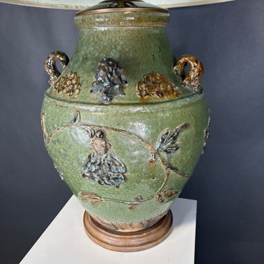 Description: Oriental Ornate Green and Brown Glazed Ceramic Jug with Shade Table Lamp Condition: GreatDetails: Tons of detail