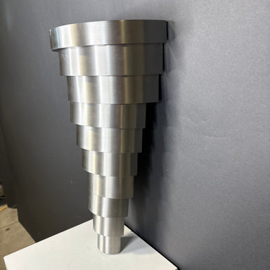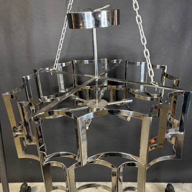 Description: Art Deco Modern 12-Light Silver Leaf and Chrome Upside Down Cake Chandelier Condition: GreatDetails: minor scratch