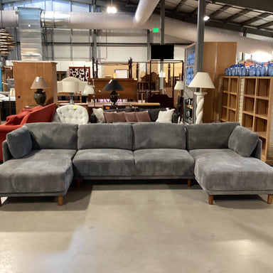 Description: Grey Chenille Wide Ribbed Corduroy 3 Piece With End Chaises Sectional Condition: Great, Slight WearDetails: Slight Wear