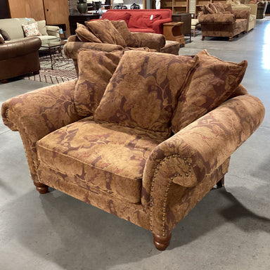 Description: Bernhardt New Vintages Gold Brown Raised Floral Nailhead Oversized ChairCondition: Some Upholstery Wear & Fading